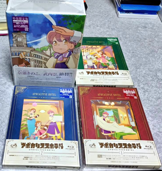 | 夏に放映が終了、完結したアニメ「アポカリプスホテル」が好きすぎて、青箱を予約購入したのですが、その最終巻が11月になってようやく届きました。 そも青箱の予約購入なんてことをしたのは「ミルキィホームズ」以来でして、いかに本作を愛してしまったのか、その程度がうかがえます。 「ミルキィ」は弾数が多かったからかその後の中古品値崩れが凄まじく、ちょっと後悔もしましたが、最近は板メディアのプレス数が激減していますし、買えずに後悔するよりはマシだと踏ん切りました。お値段は全部で4万円弱。 ![]() ↑商品は4巻構成で、最終巻には全巻収容の出来るケースが付きます。 各巻とも上品な外装でとても良いと思いました。 早速画質をチェキしてみましたが・・・・